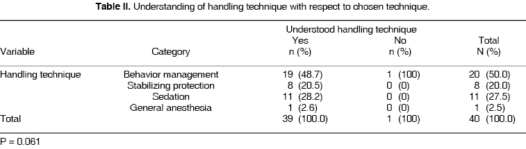 Table II shows reactions of parents when asked whether they had fully understood handling techniques to be performed on their offspring. Parents chose conduct handling first (48.7%), parents grasped the concept of this technique better. After it came sedation (44.0%), stabilizing protection (20.5%) and general anesthesia (4.0%) (Table II).