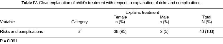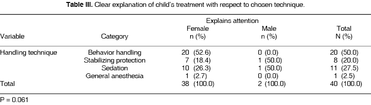 When dealing with detailed explanations about the technique to be used, it can be stated that female patients understood better conduct behavior technique (52.6%). Percentages were similar when explaining general anesthesia and sedation (23.3%), stabilizing protection rated 18.4%. When clearly explaining techniques to be used, in males, stabilizing protection technique presented the same percentage (50%) as sedation (Table III).