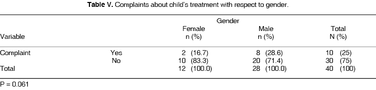 With respect to parental complaints on child treatment, Table V shows that males rate 28.5% when compared to females, which rated 16.6% (Table V).