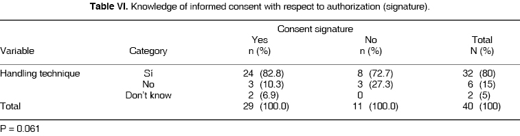 In all patients, 72% signed the informed consent form without having true knowledge of what they were signing. 82.7% of all those claiming to understand what the forms were about, signed them. 17.1% of those not understanding what they were signing, nevertheless did so (Table VI).
