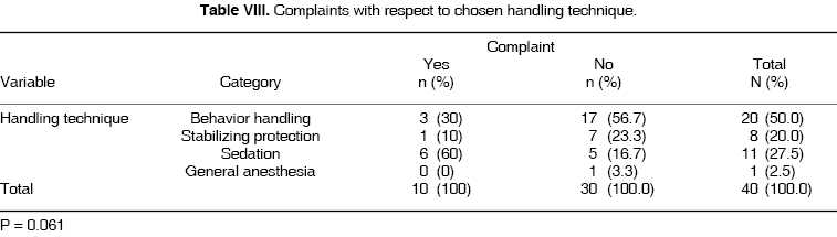 Table VIII reflects information on complaints concerning behavior techniques used. Sedation techniques bear the highest percentage of parental complaints (60%) when compared to stabilizing protection techniques (10%).