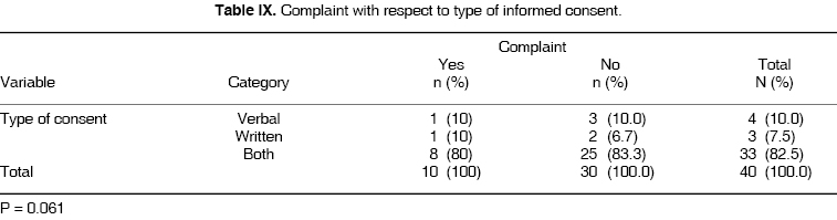 Verbal and written informed consent (jointly) bear the 80% of complaints when compared to 10% of complaints on written informed consent (Table IX).