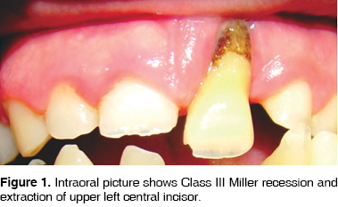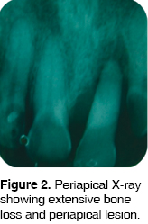 The patient informed he had been wearing a bilateral, flexible, removable dental prosthesis for about four years. Intra-oral exploration revealed pathological migration (extrusion) of tooth number 21, Miller class III recession,7 class III mobility; all these factors seriously affected aesthetics as well as function (Figure 1). A diagnosis of severe chronic periodontitis was emitted. Periapical X-rays of the area revealed severe bone resorption caused by periodontal damage, as well as a periapical lesion. The case then presented a combined endodontic and periodontal problem (Figure 2). To solve this problem, due to the aforementioned facts, extraction of the tooth was indicated. Extraction would eradicate the established infection focus and thus avoid possible later complications.