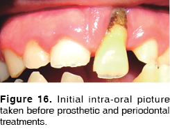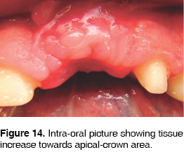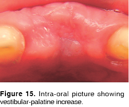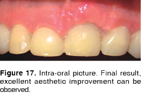 In the first procedure, a connective tissue autologous graft was placed. The graft was harvested from the palate area9 (donor area) and placed on the surgical bed (receiving area). A partial thickness flap was manufactured to later hold the graft into the periosteum. (Figures 5, to 7). (6) Seven months later, the second autologous graft was placed. This was a free gingival graft (Figures 8, to 10).10 (9) Four months later, another connective tissue graft was placed, with envelope technique, to confer greater vestibular volume (Figures 11, to 13).11 (12) Five months into the recovery process, a gingivoplasty of the area was performed to dispose of irregular areas caused by scarring due to previous surgical procedures (Figures 14, to 16). (15) The patient thus recovered function and benefited of improved esthetics (Figure 17).