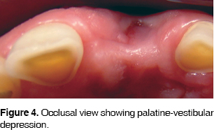 At approximately seven months after extraction, tissues had healed completely (Figures 3 and 4). Nevertheless, the situation of the alveolar process was not ideal to conduct rehabilitation. This was due to the presence of a Seiberts class III situation8 (Table I). Therefore, height and width of the alveolar process were restored with placement of soft tissue auto-grafts.