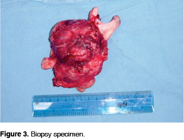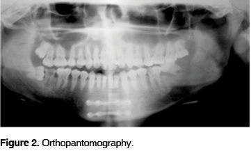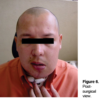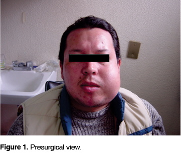 25 year old male patient was admitted in February 2002 at the Oncology Service of the Mexico General Hospital. The patient referred having for two weeks noticed presence of progressive volume increase in the parapharyngeal space. The growth was operated upon in April of the same year performing transmandibular approach. Microscopic evaluation revealed a mixed tumor (pleomorphic adenoma). Five months later, the patient attended the Head and Neck Unit of the Oncology Service at the same hospital due to the presence of a volume increase in the left genal region, together with lockjaw, dysphagia, and pain on that side of the face (Figure 1). A request was made for CAT scan and panoramic radiographic projection (Figure 2). The panoramic radiographic projection revealed a radiolucent, poorly defined lesion, spanning from the premolar area up to ascending mandibular angle and ramus. The CAT scan revealed an osteolytic expansive lesion affecting the mandibular body, extending to the oral cavity in the direction of the masticatory space. An incisional biopsy was taken. Diagnosis emitted was malign mixed tumor (malign pleomorphic adenoma). In February 2003, a hemi-mandibulectomy of the compromised area was performed. The resection rim followed a stepped design to confer stability to the prosthesis (Figure 3). To reconstruct the lost bone segment, an immediate prostheses was manufactured with thermosetting methyl, methyl-methacrylate material. This prosthesis was fixated with osteosynthesis wire at approximately 3 and 6 mm at both resection margins above the cortex. The device was designed based on orthopantomographic study as well as lateral skull X-rays (Figures 4 and 5). Histopathological study of the surgical segment revealed a malignant mixed tumor in the medial and lateral borders of the section (soft tissue). In March 2003 a chemo-therapeutic scheme was initiated, with the use of 5-fluorouracil and cisplatin concurrently with radiotherapy with 50 Gy (Grey units) in ten fractions following an accelerated fraction protocol. A thorax CAT scan performed after the surgical event revealed presence of multiple pulmonary metastases. At the 3 month post-operative follow-up appointment, the patient presented acceptable aspect and mandibular function (Figure 6). Nine months after the surgical event, the patient was still unable to afford conventional rehabilitation procedures, nevertheless, no atrophy of soft tissues, malocclusion or masticatory muscle contractures had developed.