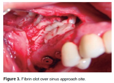 Using the plasma's fraction 2, a fibrin clot was formed to be placed as biological membrane on the maxillary lateral wall and thus achieve sinus cavity sealing (Figure 3). The consistency of the membrane was achieved after placing this plasma fraction in a tube containing calcium chloride. This procedure was similar to that used when using the fraction rich in growth factors, with the difference that in this case, a thermal block was used to accelerate clotting, which took approximately 15 minutes.