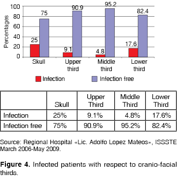 In the figure 4 data the following can be observed: percentages of patients exhibiting infections according to the affected craniofacial region. Within the analysis of this graph it can be observed that patients presenting greater frequency of infections were those with wounds in the cranial region; they were followed by patients sustaining wounds in the lower facial third. This can be explained due to the presence of hair in the area which provides an infection-prone zone since there is presence of a physical barrier or mechanical deterrent for the proper cleansing of the wound (in spite of performing trichotomy in the wound-afflicted area). With respect to lesions in the lower third of the face it can be deducted that present infections were caused by the communication existing among oral cavity wounds: the bacterial flora of the animal mixed with that of the aggressed patient. Moreover, there were minimal data of infection in patients sustaining wounds in the middle and upper third of the face.