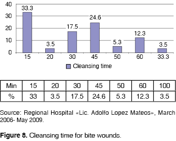 In the period comprised between march 2006 to may 2009, only 12.3% patients were infected, which is tantamount to 7 patients out of the 58 patients treated in that period. The cranial region presented greater number of infections. Handling established by the Maxillofacial Surgery Service has been effective, it consists on the following: cleansing with tertiary solution for 45 minutes plus 15 additional minutes per hour elapsed since the aggression with isodine, hydrogen peroxide and physiological solution, except for periorbital wounds which were cleansed with surgical soap. Neverhteless, the treatment is occasionally too aggressive since it elicits sweeping saprophytic bacterial flora in affected regions, which can cause infection. There are other additional external factors, such as the case of patients presenting wounds in the cranial surface, with presence of hair and poor wound hygiene exhibited by the patient. With respect to lesions in the upper third, 81.1% were located in the left auricular region; 72.7% were found in the palpebral zone. No cleansing with tertiary solution was performed on periorbital area lesions; germicidal soap and 0.9% solution were used in these cases in order to avoid damage to the eyeball (caused by chelation of isodine and peroxide). This solution was used for the same time as the tertiary solution. With respect to the middle third 81% were located in the naso-labial region; 4% of them became infected. In the lower third infection increased to 17.6%; most lesions were found in the sub-mandibular and chin areas. When studying wounds with respect to gender, it can be stated that there was predominance of male patients (57.9%) with respect to female patients. With respect to exposition time, it can be noted that, in our hospital, time elapsed from the moment of dog bite patient arrival to treatment is 45 to 60 minutes, since these patients are considered critical. Other patients had to suffer longer expositon times (90 to 120 minutes) this fact could elicit infection. In figure 8 the graph depicts greater percentages (33%) of patients receiving 15 minutes cleansing periods; followed by 24.6% patients being cleansed for 45 minutes. This could be considered the best cleansing time to prevent infections in patients as consequence of exposition to dog bite wounds in any region, without incurring the risk of a saprophytic bacterial sweep in the affected area. These procedures, in combination with antibiotic and immunological treatment for rabies prevention allow the decrease of infection caused by this type of lesion.2,12