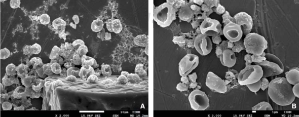 In the present study, 20 mL of peripheral blood were obtained and deposited in tubes with EDTA (ethylenediaminetetraacetic acid) anticoagulant. Rinses were conducted with a phosphate buffer solution (Evan’s solution). Several dilutions of the erythrocyte sample were prepared (1:1, 1:2, 1:4, 1:8 and 1:16); 100 μL of each of these dilutions was obtained to be then confronted with 100 μL of dental use 5.25% NaOCl (Viarzoni-T, Medental®); 0.5 μL of these samples were taken to then be deposited in a sample holder made of Zn-Cu alloy which was subjected to a process of Cu ion metallization bath, following the old Spluttering method. Microphotographs were obtained with SEM.
