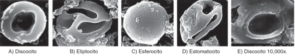 Figure 5 Morphological alterations of erythrocytes exposed to dental use 5.25% NaOCl, through images obtained with high resolution scanning electron microscopy. A) Discocyte: bi-concave dis lacking nucleus. B) Elliptocyte: elliptic form with rounded tips and small bulge in lateral walls. C) Spherocyte: spherical erythrocyte with dense hemoglobin content without central halo. D) Stomatocyte: erythrocyte with a mouth-shaped elongated central zone, E) Discocyte at 10,000x where structural damage can be observed at the level of the plasmatic membrane.