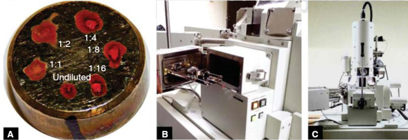 Figure 2 A) biological sample in An-Cu alloy sample holder of 1 cm height and diameter. B) Vacuum chamber of High Resolution Scanning Electron Microscope C) JEOL JSM-7600F High Resolution Scanning Electron Microscope.