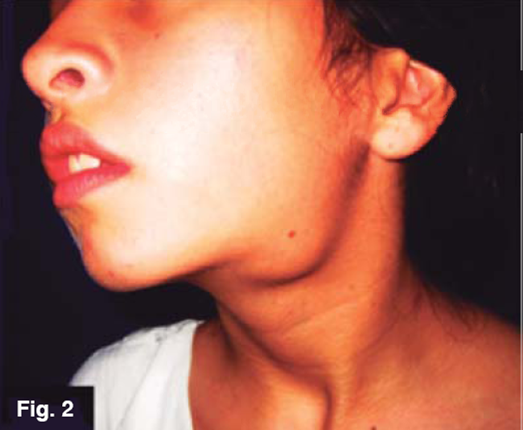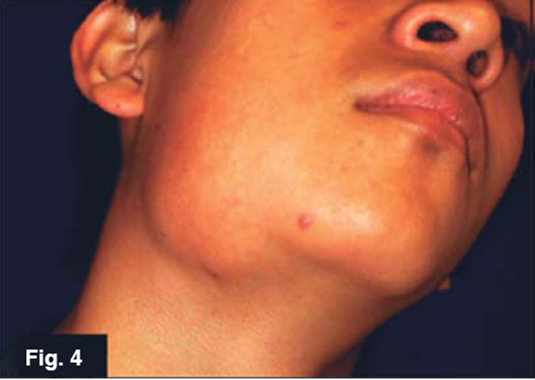 Right submandibular tumor of 10 month evolution. Lesion measured 14 × 32 mm, was mobile, indurated and adhered to deep planes (Figures 3 and 4) history of contusion was reported in the right mandibular region with asymptomatic volume increase. Treatment with anti-inflammatory drugs elicited no results. Patient denied presence of pain or fever peaks. He exhibited a thorax X-ray protocol study with negative results. Lymphoadenopathy confirmed by tomogram. FNAB yielded unspecific results. Excision biopsy was undertaken, it yielded histopathological results of Mycobacterium tuberculosum granulomatous infection. Ziehl- Neelsen test yielded positive, Löwenstein-Jensen culture yielded negative.
