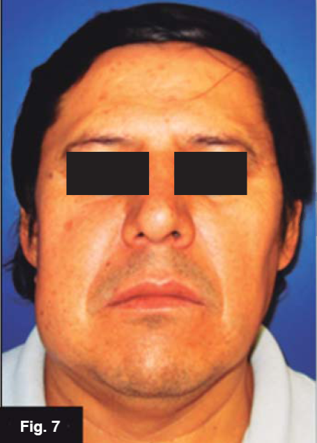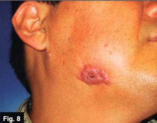 The patient exhibited mandibular ridge fistula and tumor in the right oral region of four months evolution. Lesion measured 20x21 mm, was mobile, indurated, adhered to deep planes with erythematous color (Figures 7 and 8). The patient reported noncontributory history, and denied presence of pain or fever peaks. FNAB was conducted and yielded non specific results. Excision biopsy was performed, which yielded histopathological results of granulomatous infection. Ziehl Nielsen test yielded positive results for microbaterium tuberculosum, Löwenstein-Jensen yielded negative results.