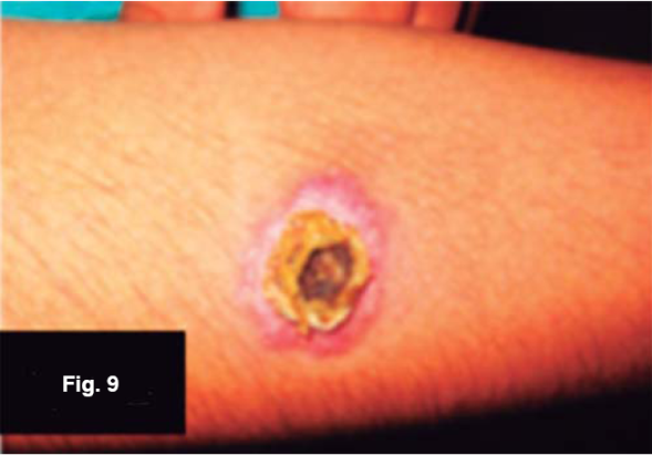 The lesion evolved to a scrofula which was drained and closed, constant infections were present. After two months, lesion healed with treatment of dicloxacillin and rinses. This enabled adequate evolution and transfer to Infectious Diseases Department.