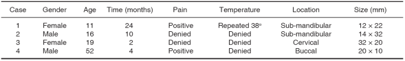 Presence of local pain, 38o C fever, with repeated episodes. Thorax x ray revealed negative results, local tomographic study confirmed presence of lymphadenopathy. FNAB tests revealed non-specific results. An incision biopsy was performed which provided an unspecific histopathological result suggestive of mycobacterium granulomatous infection. Ziehl-Neelsen test was negative, Löwenstein-Jensen culture was negative, PPD (purified protein derivative) test suggested mycobacterium infection. A sample was sent to be subjected to immunohistochemical study; it revealed positive to Mycobacterium tuberculosum.