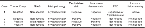 A convenience selection of patients treated in 2012-2014 at the Regional Hospital «Ignacio Zaragoza» (ISSSTE) was conducted. Patients had been diagnosed with tuberculosis and were residing in the eastern area of Mexico City. These four cases were selected due to diagnosis controversy. In selected cases, FNAB (fine needle aspiration biopsy) diagnostic tests were conducted as well as thorax X-rays, tomograms, Ziehl-Neelsen test, LowensteinJensen culture and positive immunohistochemistry to Mycobacterium tuberculosum. Definite diagnosis was achieved with three out of the six positive tests. In anamnesis, patients of this selected sampling informed of middle social and financial status, practice of adequate hygiene habits, lack of crowding, and absence of related hereditary familial history.
