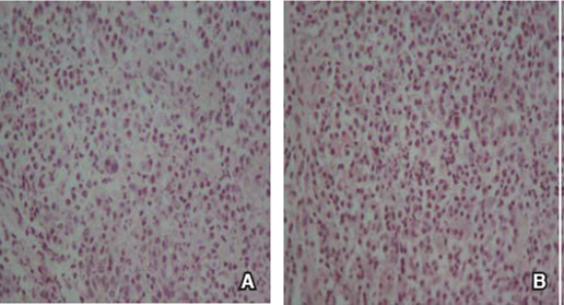 Figure 1 Samples with clinical diagnosis of asymptomatic apical periodontitis. A) Mixed inflammatory infiltrate is observed with presence of PMN neutrophils and plasmocytes H-E 40x. B) Mixed inflammatory infiltrate is observed, with PMB neutrophils and plasmocytes. H-E 40x.