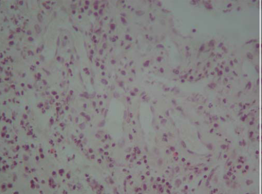 Figure 2 Histological section revealing granulation tissue evidenced by presence of multiple neo-formed vessels, fibroblasts as well as chronic inflammatory infiltrate. H-E 10x.
