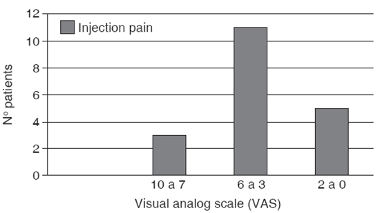 Figure 1 shows the percentages of pain perception during the anesthetic injection procedure when using Parker’s visual analog scale (VAS); 57.9% of subjects (n = 11) reported moderate pain, and this pain was cataloged on a scale between 6-3 and 26.3% as mild pain (VAS 2-0).
