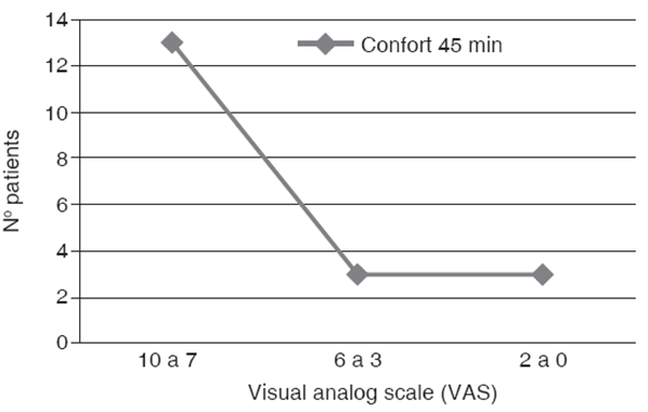 The perception of comfort that the patient felt and mentioned at the moment of feeling the soft tissue anesthesia is shown in figure 2; 68.4% of subjects (n = 13) cataloged and mentioned soft tissue anesthesia as uncomfortable (VAS = 10-7), 100% (n = 19-CI 95%) of the subjects reported anesthesia in lower eyelid skin, skin of the nose and the skin of the corner of the upper lip. Duration of the anesthetic effect ranged from 36-46 minutes for the canine tooth (Table III), duration of the anesthetic effect on the first premolar and second premolar ranged from 3 to 13 minutes.