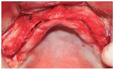 The lower jaw exhibited a bone defect compromising vestibular and lingual aspects of remaining bone at the level of tooth 4.2. Nevertheless, sufficient bone mass was found to place four implants in the inter-foramen area.