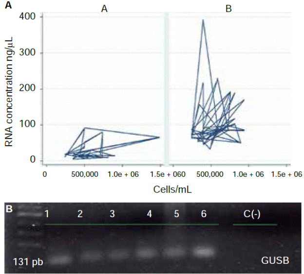 Evaluation of protocol behavior according to operative characteristics revealed that protocol в showed better behavior than protocol A, since, in general terms, better concentrations or RNA in ոց/μL-were obtained using lesser amounts of cells/mL saliva. Likewise, this protocol exhibited genie expression of G USB normalizing gene (Figure 4).
