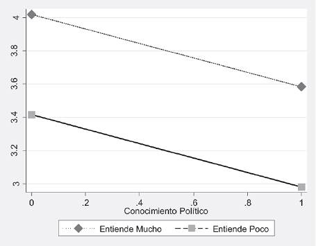 Para ilustrar el impacto de las dos variables en que se enfoca este artículo, “Conocimiento político” y “Entendimiento político”, sobre la confianza en el Presidente, el trabajo presenta las Gráficas 1 y 2. La Gráfica 1 muestra que hay una correlación positiva entre la variable independiente, “Entendimiento Político”, y la variable dependiente, “Confianza en el Presidente”. Al aumentar una, aumenta la otra; sin embargo, se evidencia que este efecto no es del todo homogéneo, cuando agregamos como variable control el conocimiento político del ciudadano (Categorías: Con conocimiento y Sin conocimiento). El entendimiento político afecta positivamente la confianza en el Presidente, este efecto va de 3.4 a 4.0 entre quienes tienen menor conocimiento político (la línea superior de la gráfica), y de 3.0 a 3.6 entre quienes tienen mayor conocimiento político (la línea inferior de la gráfica). ¿Qué significa esto? ¿Qué quiere decir que las dos líneas sean casi paralelas? Las líneas son casi paralelas porque sus pendientes son similares, casi iguales, lo que indica que el impacto de la variable independiente (Entendimiento político) sobre la variable dependiente (Confianza en el Presidente) es casi el mismo para los que tienen conocimiento político y los que no lo tienen (la variable control), pero, aquí la clave, las respectivas intersecciones de las líneas son diferentes, lo que muestra que si bien el impacto es casi el mismo, éste tiene una escala distinta para quienes poseen conocimiento político y para quienes no lo tienen. El impacto de la variable independiente comienza en 3.4 para los que su nivel de conocimiento político parece casi nulo; y en 3.0 para los que tienen un conocimiento político más alto, evidenciando que el impacto del entendimiento político sobre la confianza comienza en un punto más alto entre los que no poseen conocimiento político, que entre los que sí