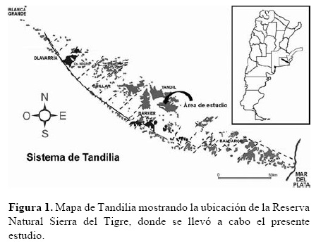 La Reserva Natural Sierra del Tigre (37°22'46" S, 59°7'44" O) se encuentra en el sistema serrano de Tandilia, al sudeste de la provincia de Buenos Aires, Argentina (Fig. 1). La reserva comprende un área aproximada de 142 ha y las altitudes máximas alcanzan los 350 a 400 m snm. El clima es templado pampeano con temperaturas medias anuales de 13° C y con precipitaciones anuales de aproximadamente 900 mm (Velázquez et al., 1998).