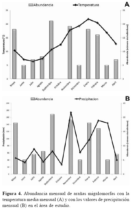 De acuerdo con la diversidad beta temporal para las estaciones se obtuvieron los siguientes valores: β= 1.7 para el invierno, junio, julio y agosto, verano; diciembre, enero y febrero, y otoño; marzo, abril y mayo; β= 3 para la primavera, septiembre, octubre y noviembre. El mayor recambio de especies tuvo lugar durante la primavera. La similitud entre los diferentes meses diferenció 2 grupos de acuerdo con las abundancias relativas, noviembre, enero, septiembre y mayo fueron los más abundantes, mientras que en el otro grupo restaron los meses de menor abundancia (Fig. 3). Los valores máximos de abundancia se correspondieron con altos valores de temperaturas en el área durante el periodo de estudio, y consecuentemente, los menores valores de abundancia se observaron durante el otoño; marzo y abril; e invierno; junio, julio y agosto (Fig. 4A). No se encontró correlación de la temperatura con la abundancia de migalomorfas (r= -0.284, p= 0.37). Sin embargo, durante los periodos de baja precipitación, en los meses de abril, junio, agosto y octubre, la abundancia disminuyó considerablemente. Cuando las precipitaciones fueron altas durante fines de primavera y verano, noviembre, enero y febrero; la abundancia de arañas migalomorfas aumentó, a excepción de marzo (Fig. 4B). A pesar de no haber encontrado correlación de los valores de precipitación con la abundancia de las migalomorfas (r= -0.44, p= 0.151), el análisis de conglomerados agrupó los meses con altas abundancias de arañas migalomorfas, los cuáles se correspondieron con altos valores de precipitación. Esto podría explicarse por una mayor disponibilidad de presas y consecuentemente, una mayor actividad de las arañas (Uetz, 1976, Riechert y Luczark, 1982; Ferretti et al., 2010, 2012).