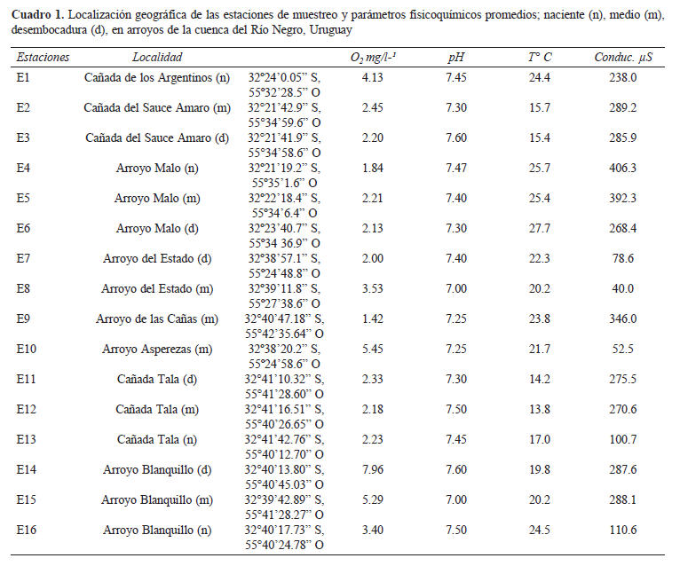 El estudio se realizó en 3 áreas en los departamentos de Durazno y Tacuarembó, donde existe una intensa actividad forestal. Se establecieron 16 sitios de muestreo en 8 arroyos de bajo orden (< 3), de aguas someras, de velocidad moderada, de fondos arenosos, con presencia de cantos rodados, abundante hojarasca y ausencia de vegetación exótica (Fig. 1; Cuadro 1). Se realizaron 4 salidas de campo entre diciembre de 2006 y diciembre de 2007, una en cada estación del año.