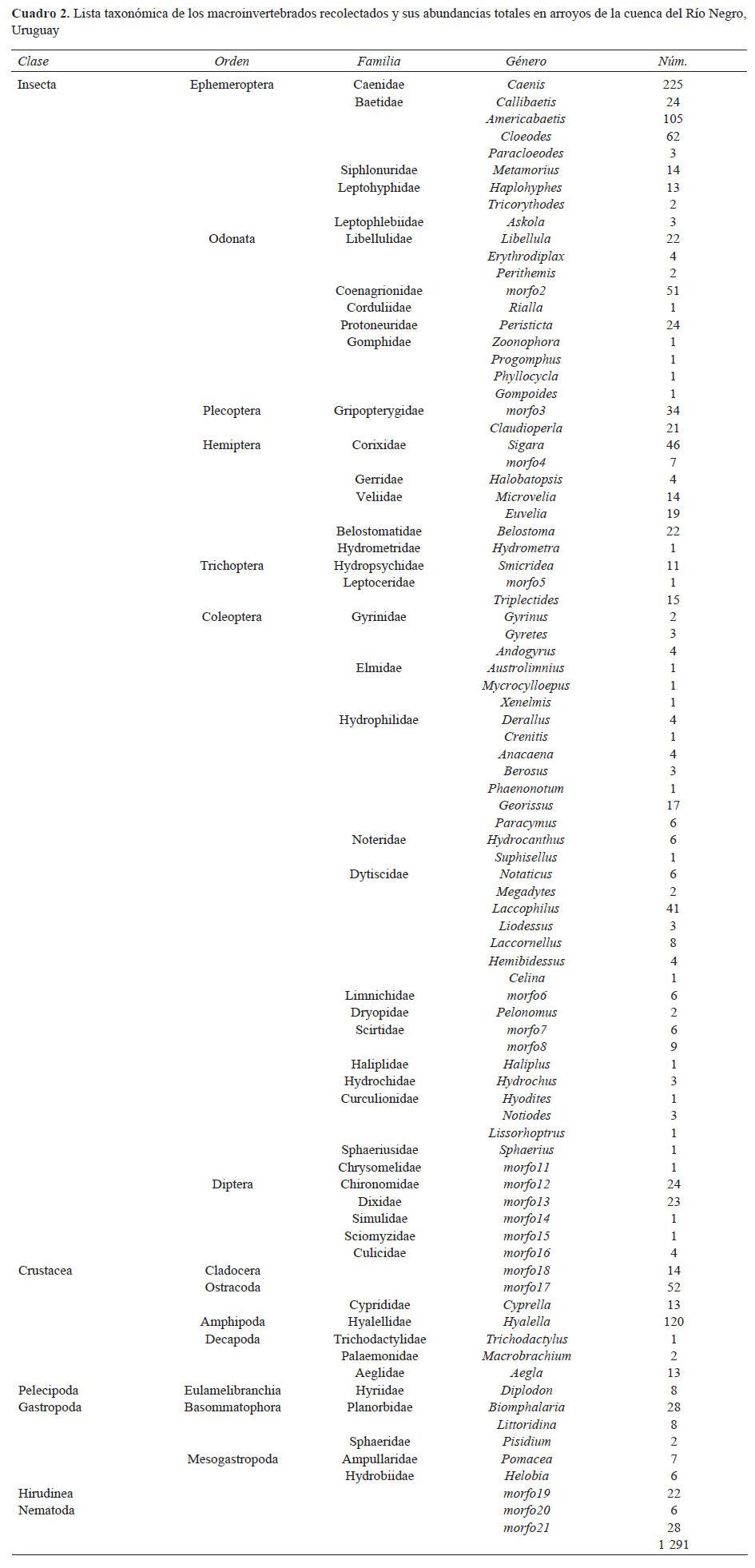 Uruguay cuenta con una densa red hidrográfica, a pesar de ello, el conocimiento de las comunidades de macroinvertebrados acuáticos es insuficiente. Sumado a esto, en las últimas décadas se ha producido un avance en la forestación con especies exóticas, provocando cambios en la vegetación ribereña de algunos ríos. El objetivo de esta investigación fue determinar la composición y estructura trófica de la comunidad de macroinvertebrados así como su relación con algunos parámetros fisicoquímicos en 8 ríos donde el bosque nativo se encuentra bien conservado, y sentar las bases para futuros estudios. Las muestras fueron recolectadas entre diciembre de 2006 a diciembre de 2007. Temperatura, oxígeno disuelto, pH y conductividad se midieron in situ. Se determinaron la composición y la abundancia taxonómicas y se realizaron análisis de componentes principales y de correspondencia canónica con los parámetros fisicoquímicos y biológicos. La diversidad alfa se calculó utilizando los índices de Shannon-Weaver (H'), dominancia de Simpson (D) y equidad de Pielou (J'). Para la determinación de la diversidad beta se empleó índice de similitud de Bray-Curtis. Un total de 1 291 ejemplares pertenecientes a 92 taxones fueron registrados. Los taxa más abundantes fueron Ephemeroptera (36%), Amphipoda (17%) y Coleoptera (12%). Los ríos muestran una gran diversidad y una baja dominancia. Conductividad, pH y temperatura fueron los factores principales en la determinación de la distribución y composición de los macroinvertebrados.