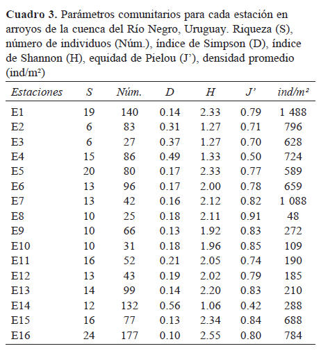 La clase Insecta representó el 76% de la muestra con 961 ejemplares recolectados. Dentro de ésta, el orden Ephemeroptera presentó la mayor abundancia con 456 individuos (47% del total de insectos y 36% del total de la muestra), seguido por el orden Coleoptera con 149 individuos (16% del total de insectos y 12% del total de la muestra). Entre los crustáceos, con 215 ejemplares recolectados (17% del total de la muestra), el orden más abundante fue Amphipoda con 120 ejemplares. El orden más diverso en cuanto al número de familias fue Coleoptera con 13, los demás estuvieron representados por 6 (Crustacea) y 1 (Plecoptera) familias. El taxón que estuvo presente en todos los sitios fue el género Caenis, con 225 ejemplares, alcanzando la mayor densidad en el sitio de muestreo E4 durante el verano, seguido por Hyalella con 120 ejemplares, alcanzando la mayor densidad en el sitio E1 durante la primavera (Cuadro 2).