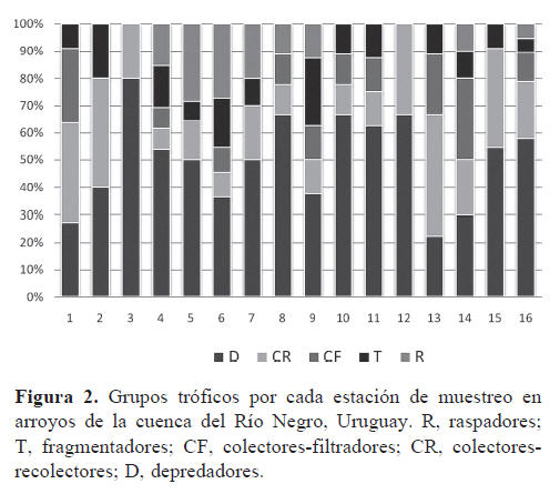 Los grupos tróficos con mayor abundancia fueron los depredadores (51%) y el colector-recolector (20%) presentes en todos los sitios muestreados. Los colectores-filtradores (10%) se encontraron presentes en 13 sitios, los fragmentadores (10%) en 10 y los raspadores (9%) en 8 (Fig. 2).