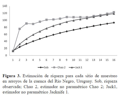 La curva de acumulación de especies observada se aproximó suavemente a la riqueza asintótica, pero siempre por debajo de los estimadores de riqueza. El estimador Chao 2 evidenció que se muestreó el 75% de las especies presentes, mientras que el Jacknife 1, el 77% (Fig. 3).