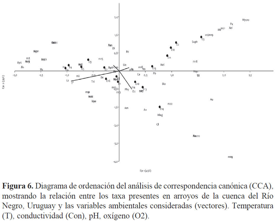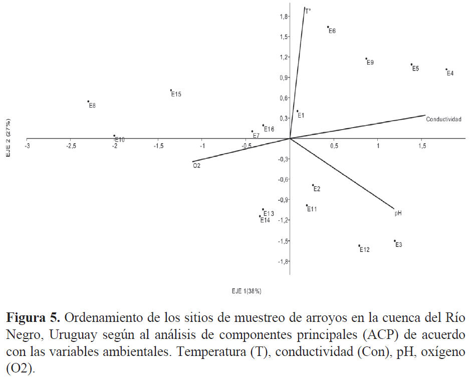 Diferentes autores resaltan que los factores fisicoquímicos del medio acuático, como pH, conductividad, oxígeno disuelto y temperatura, son determinantes en la distribución de los macroinvertebrados acuáticos y son, además, los parámetros a los que los organismos son más sensibles (Quinn y Hickey, 1990; Roldán, 1996; Toro et al., 2002; Domínguez y Fernández, 2009; Carvacho, 2012; Meza et al., 2012). Esto concuerda con lo observado en el presente estudio, donde el ACP resaltó la importancia de las variables: conductividad, pH y temperatura, demostrando así su influencia sobre la comunidad estudiada. En otras investigaciones se han documentado resultados similares. Chalar (1994) encontró en el Arroyo Toledo que el oxígeno es la variable con mayor influencia sobre las comunidades de macroinvertebrados, mientras que para el río Santa Lucía lo fueron el oxígeno y la conductividad (Arocena et al., 2008). Distintos autores para otras regiones neotropicales encontraron que la temperatura, el oxígeno, la conductividad y los sólidos disueltos son las variables que mejor explican el funcionamiento de los sistemas lóticos (Mancilla et al., 2009; Carvacho, 2012).