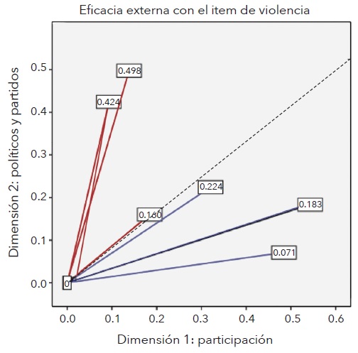 Se utilizó la técnica de correspondencias múltiples, ya que permite trabajar con variables de tipo ordinal y categóricas para reducirlas y categorizarlas en dimensiones. Estas dimensiones se refieren a la eficacia externa. La fortaleza de cada dimensión dependerá de la potencia en la contribución de cada uno de los ítems. Las dimensiones representan la cercanía de los individuos cuando seleccionan las mismas modalidades de respuestas. Los ítems que están próximos e integran una dimensión, representan conjuntos de respuestas que fueron elegidas por el mismo grupo de individuos formando una dimensión.
