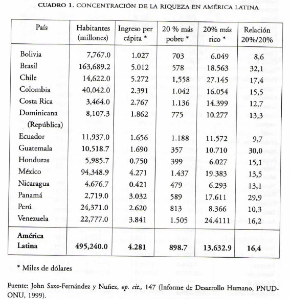 La idea de la tercera revolución industrial promovida como el inicio de una nueva fase del desarrollo capitalista global está cimentada en el maridaje entre la computadora y la fibra óptica; es decir, en la revolución de las tecnologías de la comunicación, la computación, y el crecimiento de los sistemas de información. Sin embargo, este nuevo avance no ha comprobado que el capitalismo haya sufrido transformaciones esenciales19 en su manera de estructurar la forma esencial de producir riqueza. La posibilidad de impulsar una transformación de las fuerzas productivas del sistema capitalista no requiere necesariamente del desarrollo y exportación de la tecnología, pero este proceso ha demostrado que funciona para agilizar, simplificar y sistematizar la venta de servicios y la continua expoliación de riqueza de los países latinoamericanos.20 En el primero de los dos cuadros siguientes "Concentración de la riqueza en América Latina", se puede observar la inequitativa y desigual distribución de la riqueza en esos países.