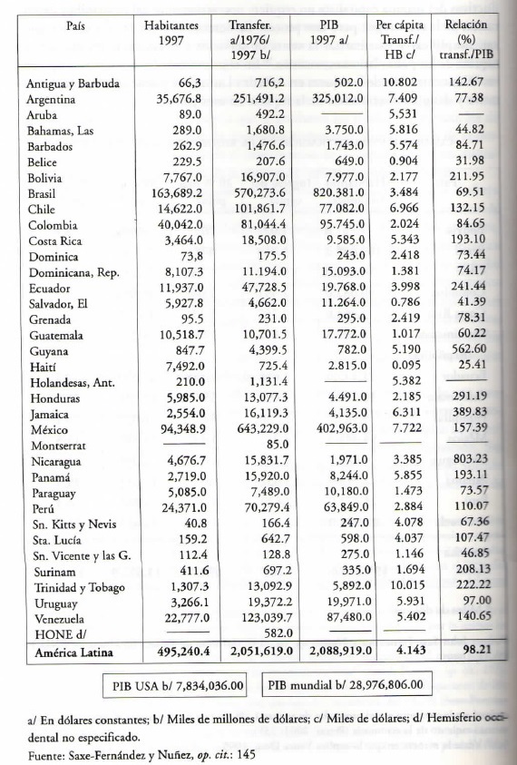 En el cuadro anterior se descubre lo que señalaba más arriba referente a la indiscriminada expoliación de riqueza de los países latinoamericanos. Nada mejor que citar la acertada comparación hecha por John Saxe-Fernández y Delgado.