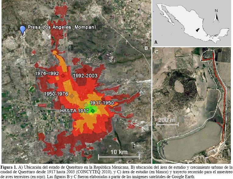 La ciudad de Querétaro tiene uno de los crecimientos demográficos más elevados de México (Lamy 2000). Su zona urbana aumentó de 474 ha en 1950 a más de 15,544 ha en 2005 (Figura 1), lo que representa un crecimiento de 3,278%; mientras que su población aumentó cincuenta veces en este mismo periodo (PNUMASEDESUCONCYTEQ 2008). Desde su fundación, el crecimiento de la zona urbana en Querétaro ha afectado radicalmente las áreas naturales de la región y causado la desaparición de numerosos manantiales y otros cuerpos de agua (Zavala 2009), que fueron abundantes hasta el siglo XIX (Balbontín 1867) y probablemente principios del XX, al igual que en otras zonas del centro de México (Grimm et al. 1997). Actualmente, la pérdida de ambientes naturales se refleja en las comunidades de aves urbanas, que presentan una menor riqueza y una composición de especies diferente a la encontrada en la periferia de la ciudad de Querétaro (PinedaLópez 2009). Esta situación podría empeorar en los próximos años, ya que el crecimiento de la ciudad continúa a un ritmo acelerado y los pocos refugios naturales periurbanos que subsisten hoy para la fauna y flora de la región podrían verse afectados, si no se realizan las acciones adecuadas para su protección.