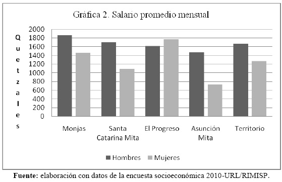 En promedio en los cuatro municipios los hombres reportan un salario mensual promedio mayor en 31% al de las mujeres, con un salario promedio para los hombres de Q.1,664.00 contra Q.1,265.00 de las mujeres. En el municipio de El Progreso los datos muestran que el salario mensual promedio de las mujeres es mayor al de los hombres. En los otros tres municipios la situación es inversa, ejemplificando la desigualdad de género que en materia salarial se practica en el territorio. Esta situación es más severa en el municipio de Asunción Mita, donde el salario promedio de hombres es el doble de las mujeres. Es de recordar que este municipio reporta el menor salario promedio de los cuatro municipios.