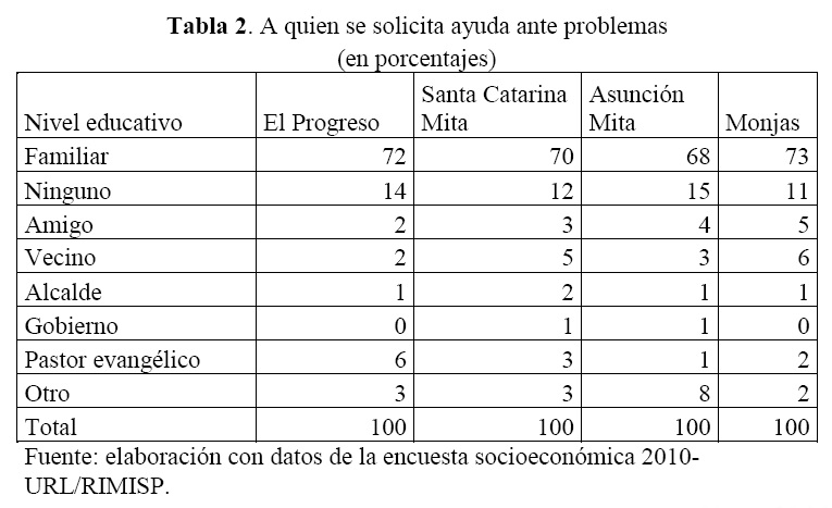 A la pregunta ¿A quién pide ayuda cuando tiene problemas? la mayoría de respuestas, más del 65%, indicaron que a un familiar. La segunda respuesta en importancia fue ninguno, seguido por las de amigo o vecino. En esta pregunta no hubo diferencias importantes en las respuestas obtenidas en los cuatro municipios. Las respuesta obtenidas, unidas a las del préstamo, indican que los vínculos familiares tienen una función relevante en la conformación del capital social del territorio estudiado.
