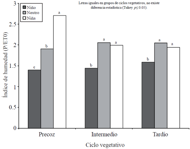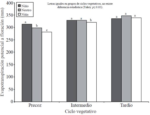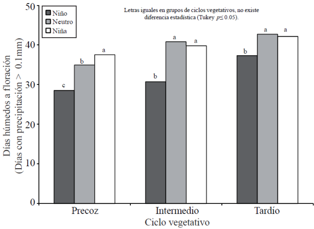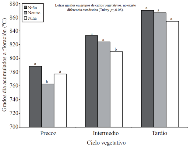 In regard to the vegetative cycle analysis, the phase El Niño years accumulated less "DH" (Figure 2). The varieties of intermediate and late cycles showed no significant difference between Neutral and La Niña years, while early varieties are statistically different between the three phases of ENSO.