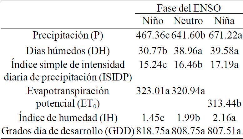 Simple daily intensity index of precipitation (ISIDP) showed differences between the three phases being the fastest years La Niña wet day precipitation (17.19 mm) in contrast Niño years (15.24 mm). Potential evapotranspiration (ET0) showed no difference between Niño and neutral years (> 320.9 mm); however, La Niña years were 9 mm lower with respect to El Niño. Moisture content (IH) showed statistical differences between the various stages of ENSO, but in terms of classification rate only in phase transits El Niño "wet-wet" environment whereas in years La Niña phase with neutral and the atmosphere is very wet. Finally, no differences were found for phase ENSO in development accumulated degree days (GDD) being the range found between 818.75 and 807.51 °C. Ruiz et al. (1999) quoting various authors indicated that maize thrives in multiple environmental conditions but, this plasticity is influenced by crop growth habits, which is found with those found in this study (Table 2).