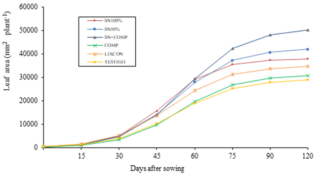 Mineral or chemical fertilizers are the most used inputs in agriculture, such as the use of urea and phosphate diamonium, these provide nutrients that the plant takes advantage of immediately (Zhang et al., 2016) or organic with the use of biofertilizers such as compost, earthworm humus, animal waste, mineral broths, rock meal, fermented organic fertilizers (Restrepo, 2006; Figueroa-Barrera et al., 2012). The fertilization of the crops, especially of N, tends to increase the biomass and the foliar area. Winter wheat has the best suitable leaf area index through the rational application of fertilizers (Li et al., 2008). The production of seedling biomass of Liquidambar styraciflua L. is significantly related to the specific leaf area, the changes in leaf area and the concentration of leaf N explain 90% of the growth responses (Chang, 2003). The application of N increased the growth and foliar area, the combination of N and phosphorus (P) increased the nutrimental absorption, which only with the contribution of P (Chang, 2003). The leaf area index increased with the density of planting and nitrogen fertilization, with a consequent increase in the yield of the plants (Olsen and Weiner, 2007).