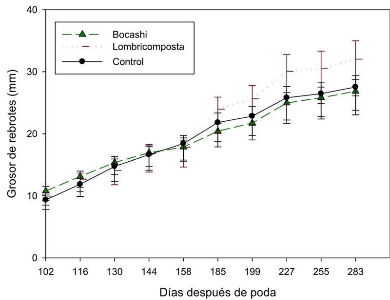 After pruning and at the end of a period of 16 weeks it was observed that the treatment with bocashi had an average of 12.87 sprouts per plant, vermicompost 8.87 and control 13.12. In this variable, no statistical differences were found between treatments (p= 0.079). This result could be due to the trunk diameters of the subjects fertilized with vermicompost were 18% lower than those of the control, while in bocashi they were 15% lower than the control, which is related in the increase to the number of sprouts, which was proportional to the diameter of the stems.