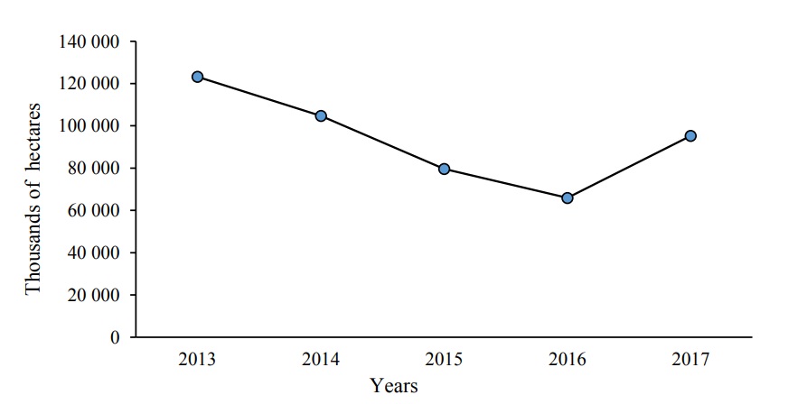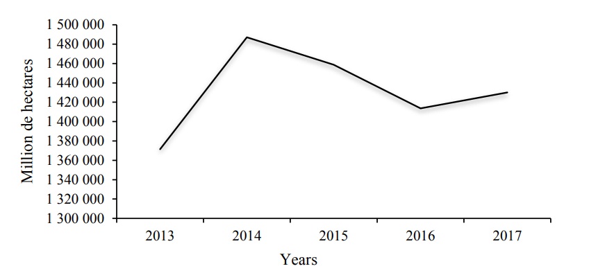 Figure 1 Area planted with beans (millions of hectares), nationally, during the spring-summer agricultural cycle, in the period 2013 to 2017 (SIAP- Statistical yearbook of agricultural production).
