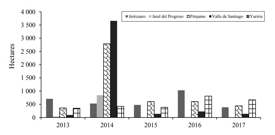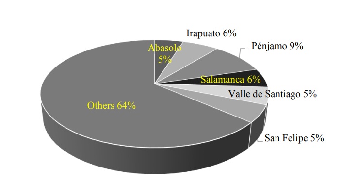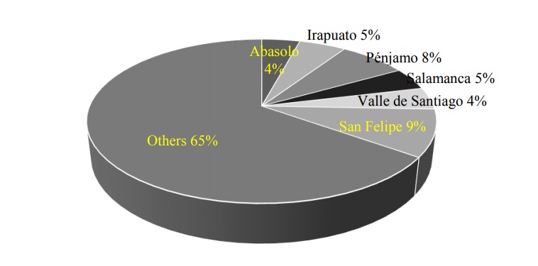 As mentioned, Guanajuato contributes 6% of the national total, where the surface is distributed in a similar manner in all municipalities, with San Felipe, Pénjamo, Salamanca and Irapuato, Abasolo and Valley of Santiago participating with 9, 8, 5 and 4% respectively, while 65% includes the other municipalities of the state (Figure 2).