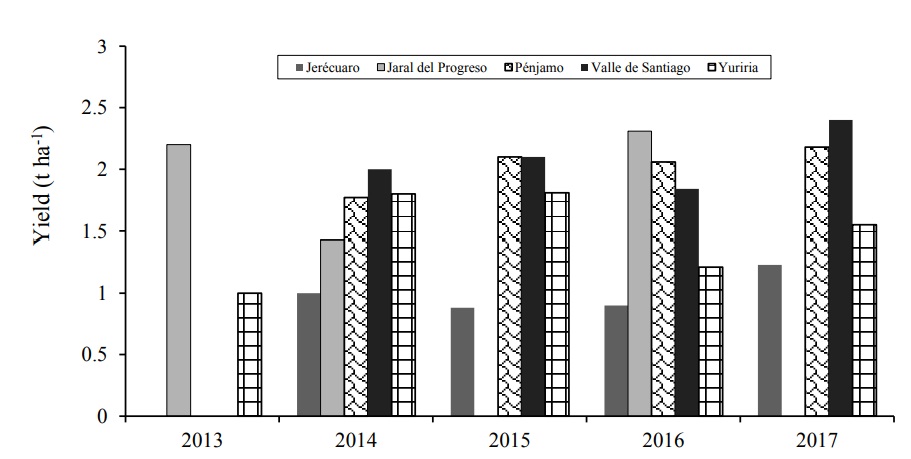 Figure 10 Yield per hectare of chickpea, in municipalities of the state of Guanajuato, during the autumn-winter agricultural cycle, in the period from 2013 to 2017 (SIAP- Statistical yearbook of agricultural production).