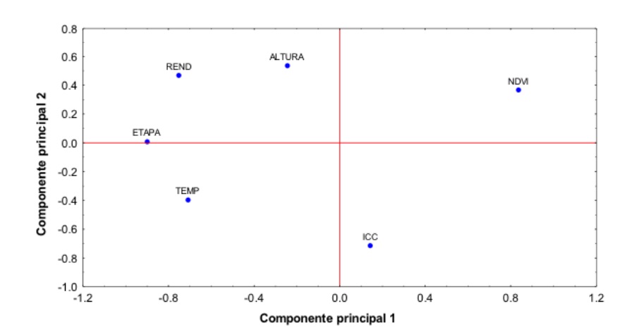 In order to clarify the relationships detected by the ACP, Pearson correlations were made between pairs of variables, which showed that HEIGHT was the variable that was most associated with others, because it maintained a positive and significant association with TEMP (r= 0.51). ), with the REND (r= 0.61) and with the STAGE (r= 0.51), but it was negatively and significantly related to the NDVI (r= -0.31), confirming the relationships detected by the ACP shown in Figure 1, where the aforementioned was appreciated. For the CCI, no significant associations were found at this stage.